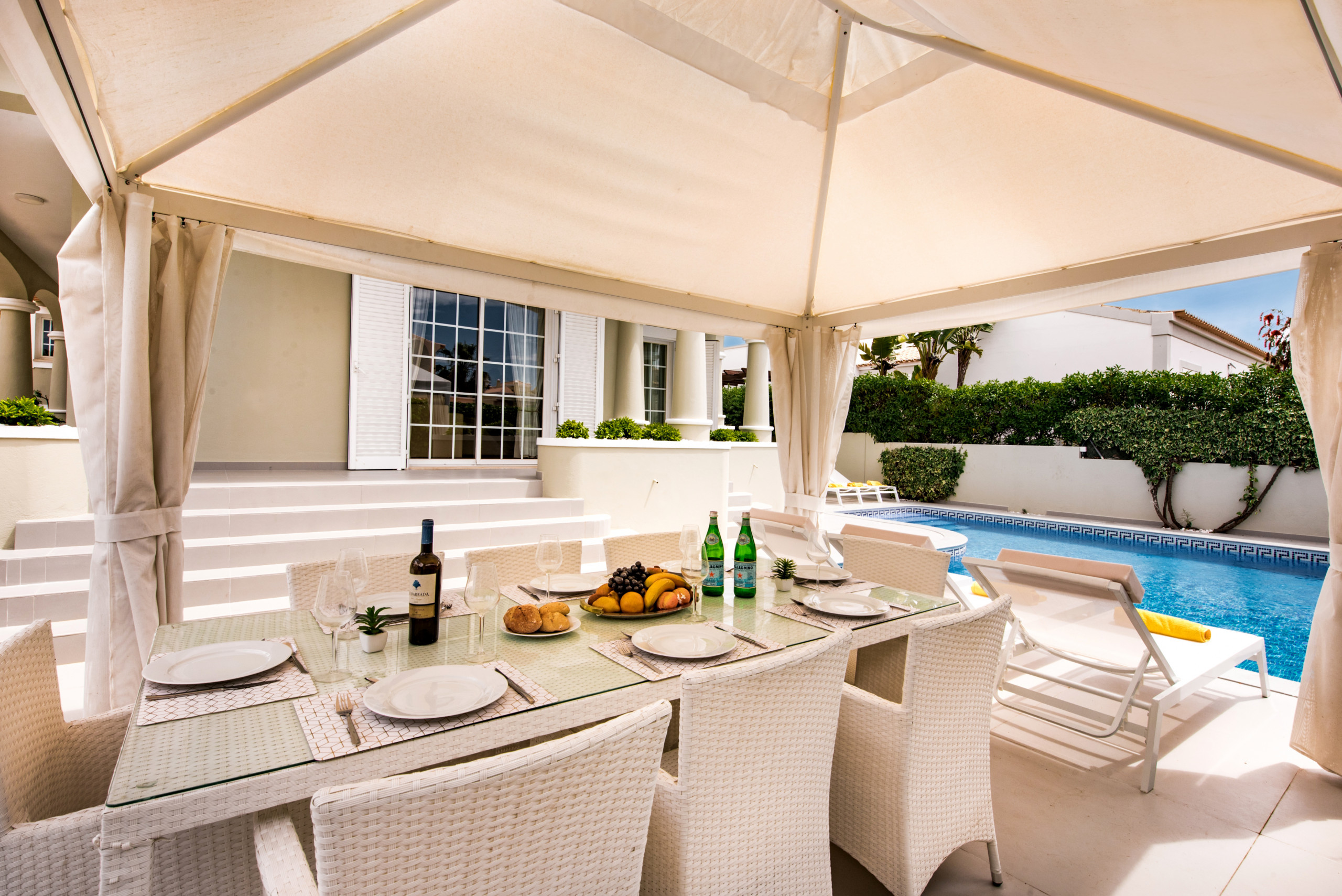 L'extérieur dispose d'une belle piscine de 7 x 7 m (la piscine peut être chauffée, c'est une option supplémentaire et la température sera comprise entre 26 et 28 degrés) et un endroit charmant pour se détendre et passer les journées au bord de la piscine ou pour déjeuner ou dîner en famille.