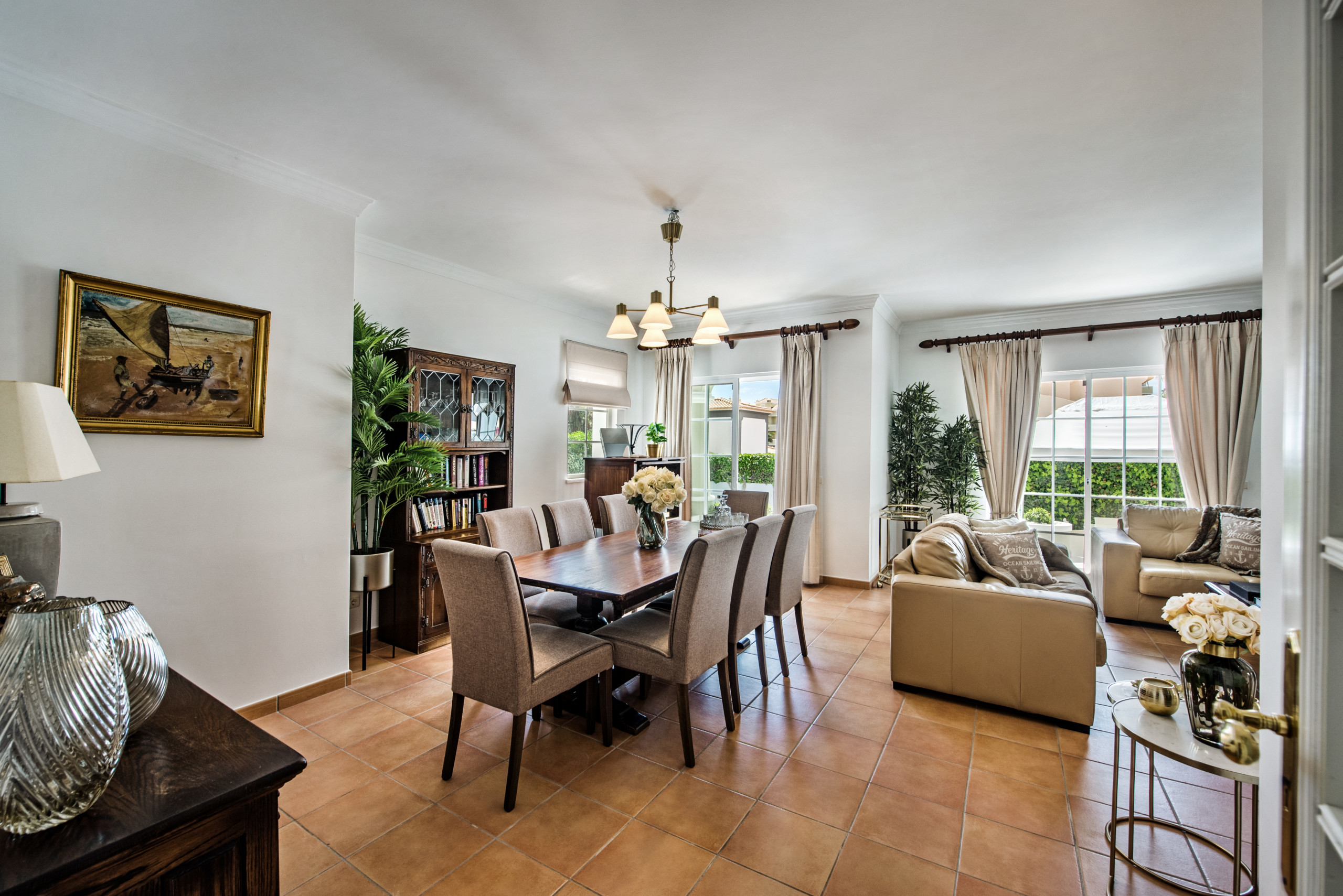 La porte principale s'ouvre sur un couloir avec un salon/salle à manger sur la gauche. Le salon décloisonné dispose de nombreux sièges autour de la cheminée et d'un ensemble de portes-fenêtres donnant sur le jardin. D'un côté, il y a une table à manger et des chaises où vous pouvez vous asseoir et profiter d'un repas en famille. La cuisine entièrement équipée est adjacente, donnant sur la piscine et le jardin.