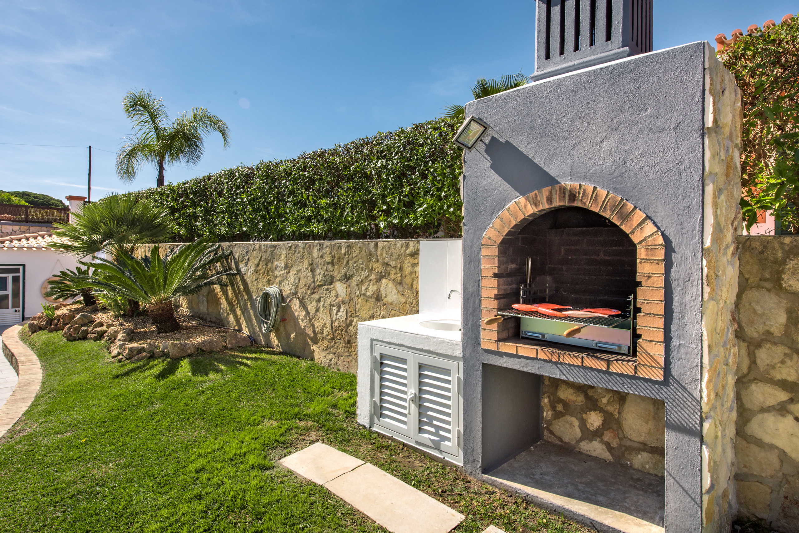 The property is completely walled and fenced, with a pedestrian gate leading to the entrance and a larger gate leading to the driveway. The private swimming pool is located at the side of the property , receiving sunshine all day. From the kitchen and the pool terrace is a typical Algarvian brick built BBQ, table and chairs, great for entertaining friends and family with a meal alfresco.
