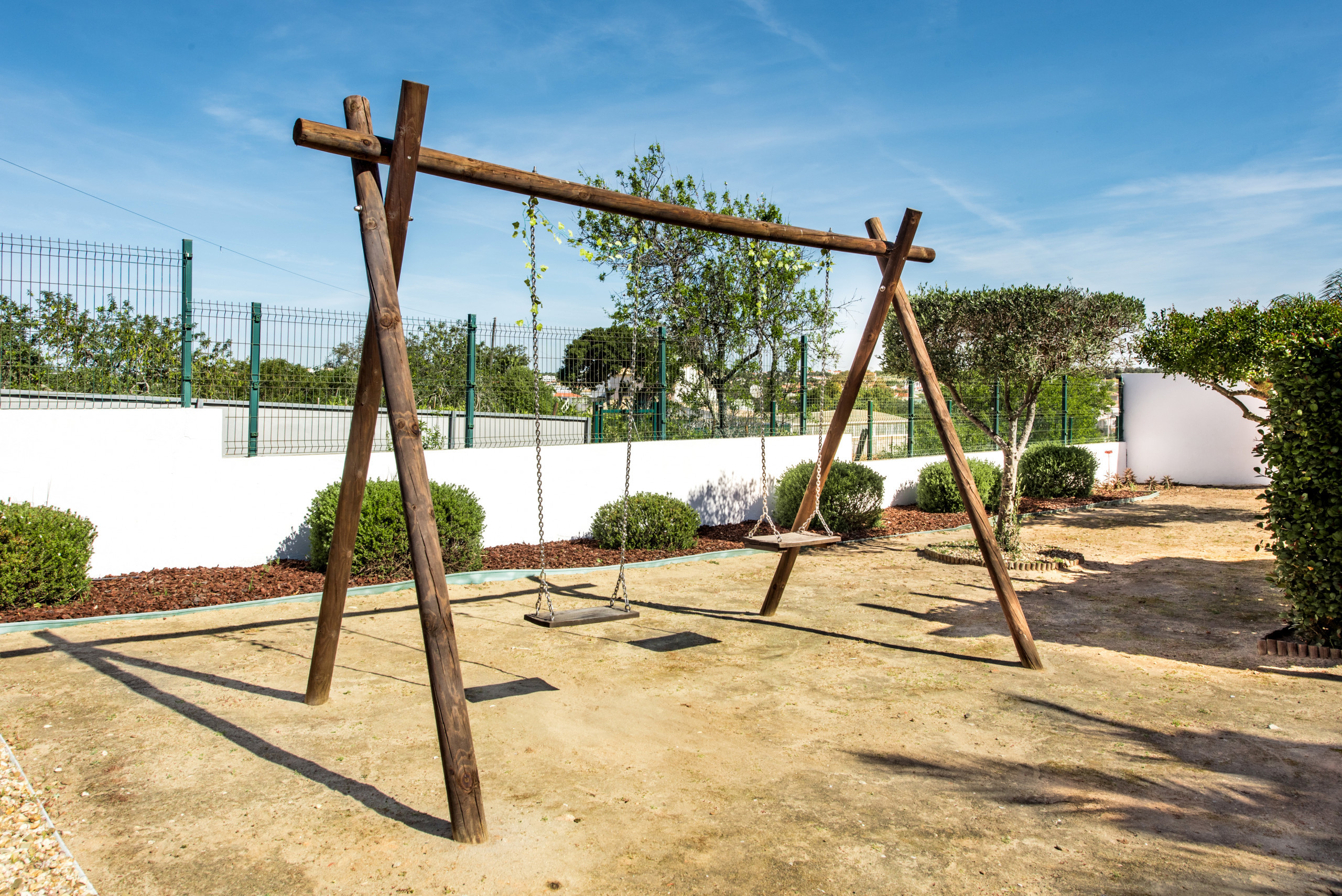 There is a playhouse and two swings for childrens play outside.